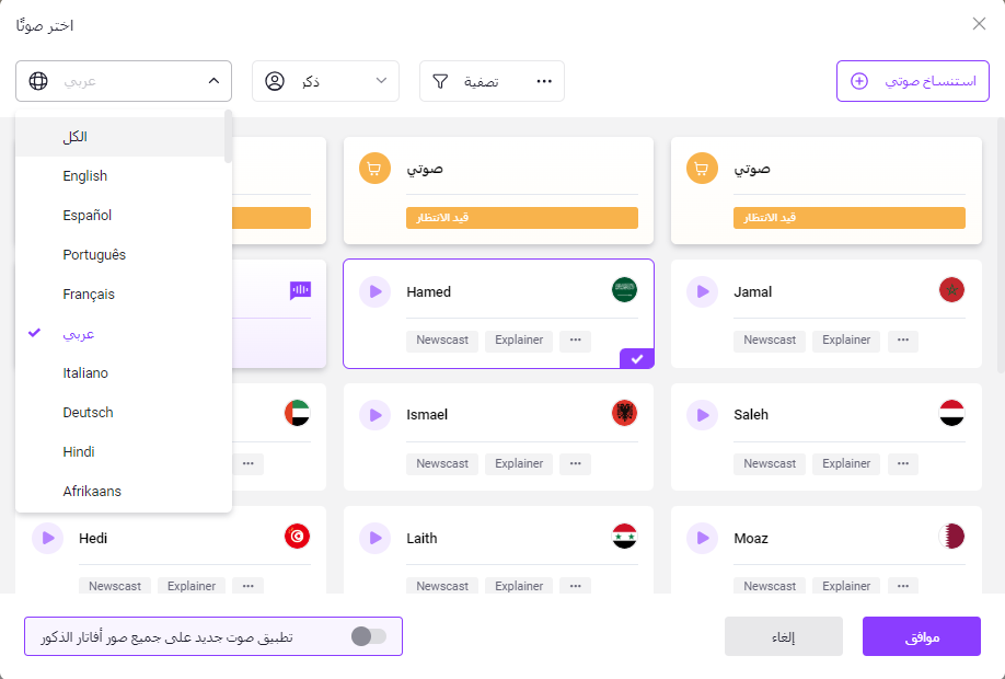 استعرض مجموعة الأصوات المتاحة واختر الصوت الذي يعبر عن النبرة والأسلوب المطلوبين للفيديو. يمكنك الاختيار من بين مختلف اللهجات والأصوات الطبيعية لإضفاء الحيوية على الأفاتار.