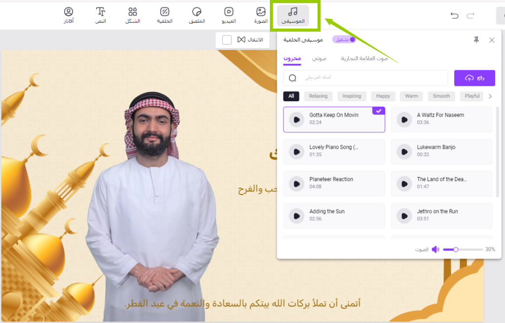 لإضفاء الطابع الشخصي على الفيديو، أضف الموسيقى التصويرية، واختر من بين خلفيات متنوعة، وطبق التأثيرات البصرية والانتقالات لتعزيز جاذبية الفيديو وتأثيره.